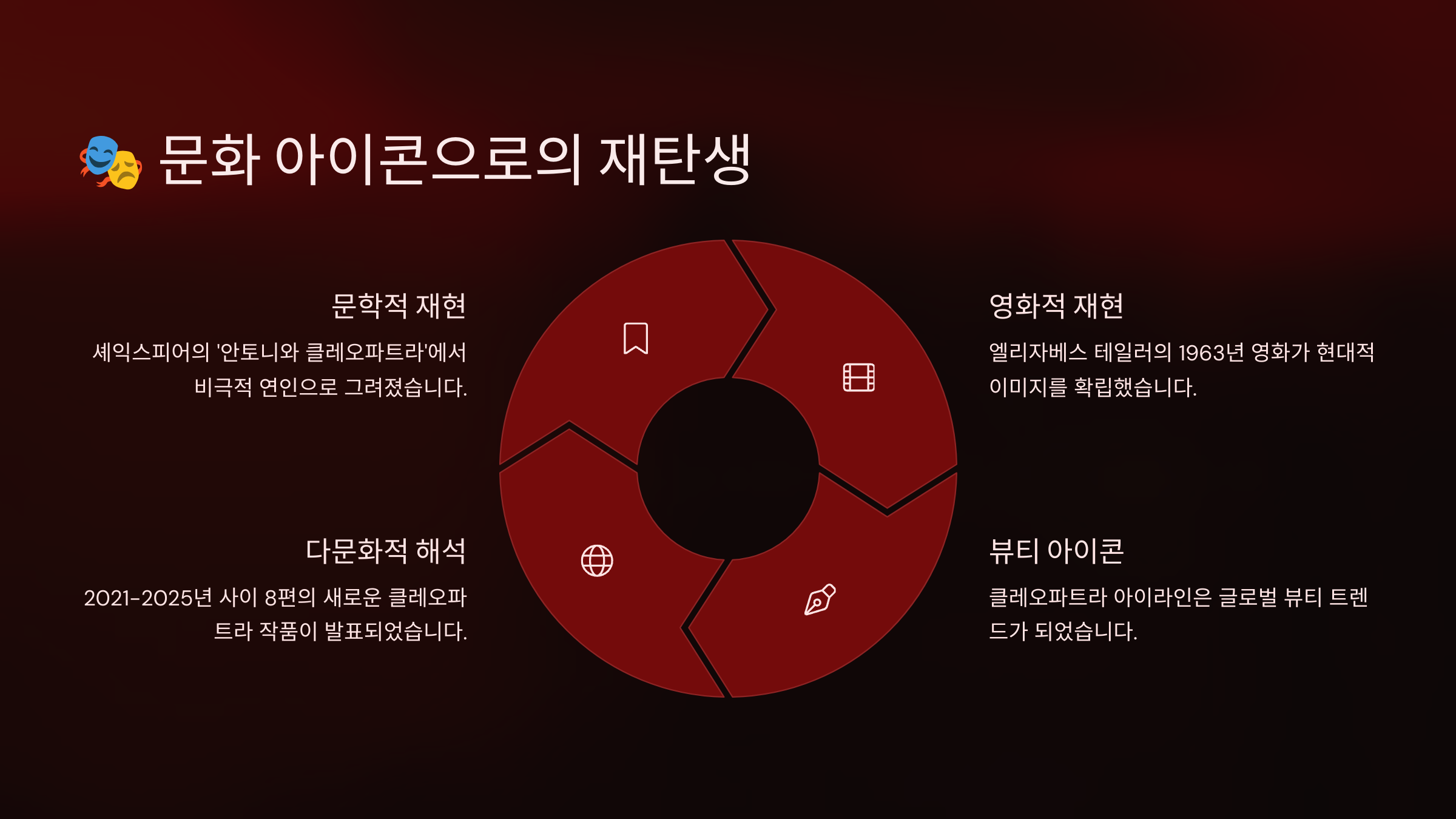이처럼 클레오파트라는 2000년 전 여왕이 아니라 지금도 우리 삶 속에 살아 숨 쉬는 강력한 문화 콘텐츠예요.