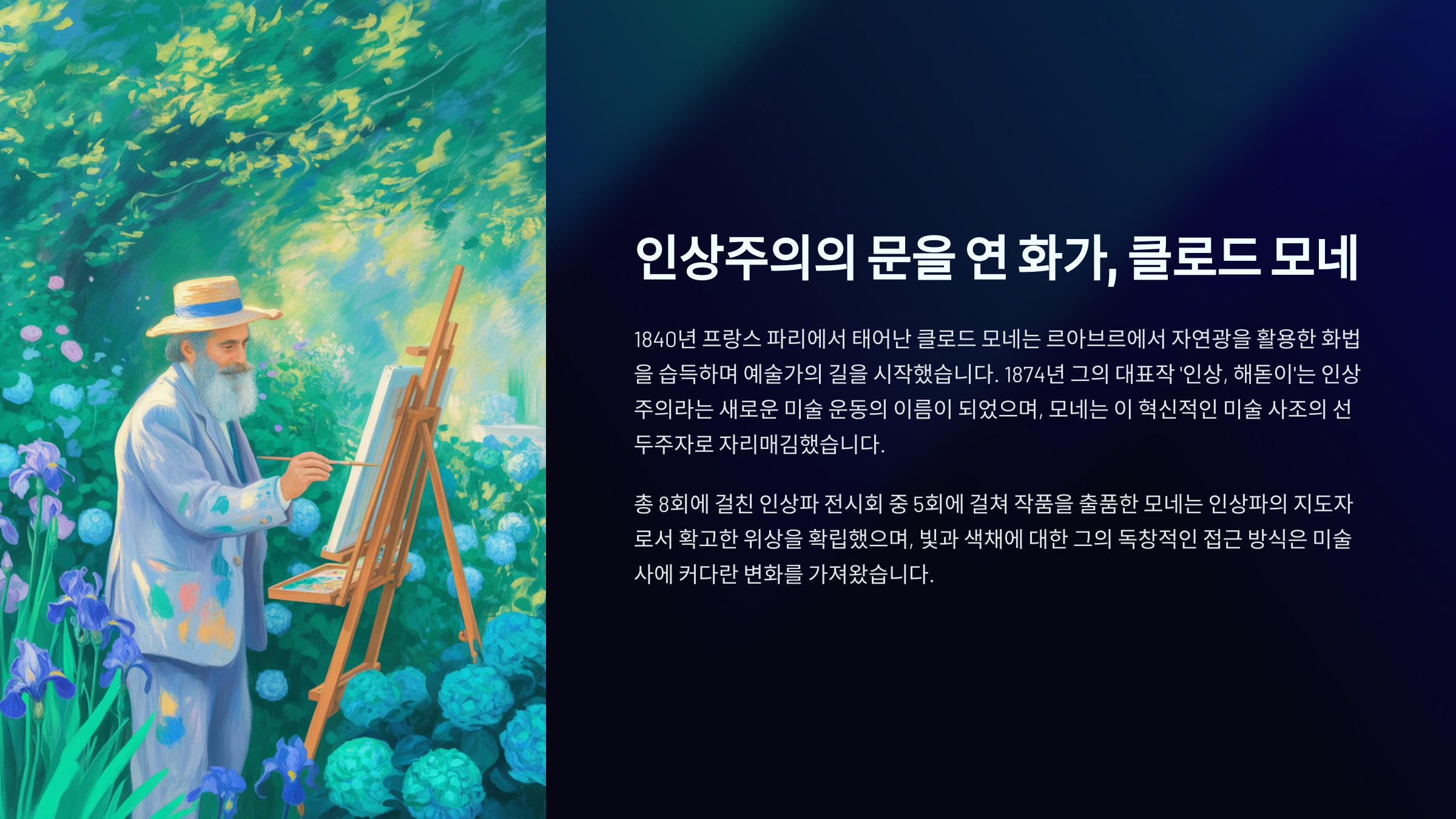 현대에 와서는 전통적인 미술관뿐만 아니라 디지털 미디어를 통해서도 모네의 세계가 재조명되고 있어요. 프랑스, 한국, 일본 등 세계 곳곳에서 진행되는 ‘모네 몰입형 전시’는 바로 그의 회화가 ‘느낌을 전달하는 언어’였기 때문이에요.