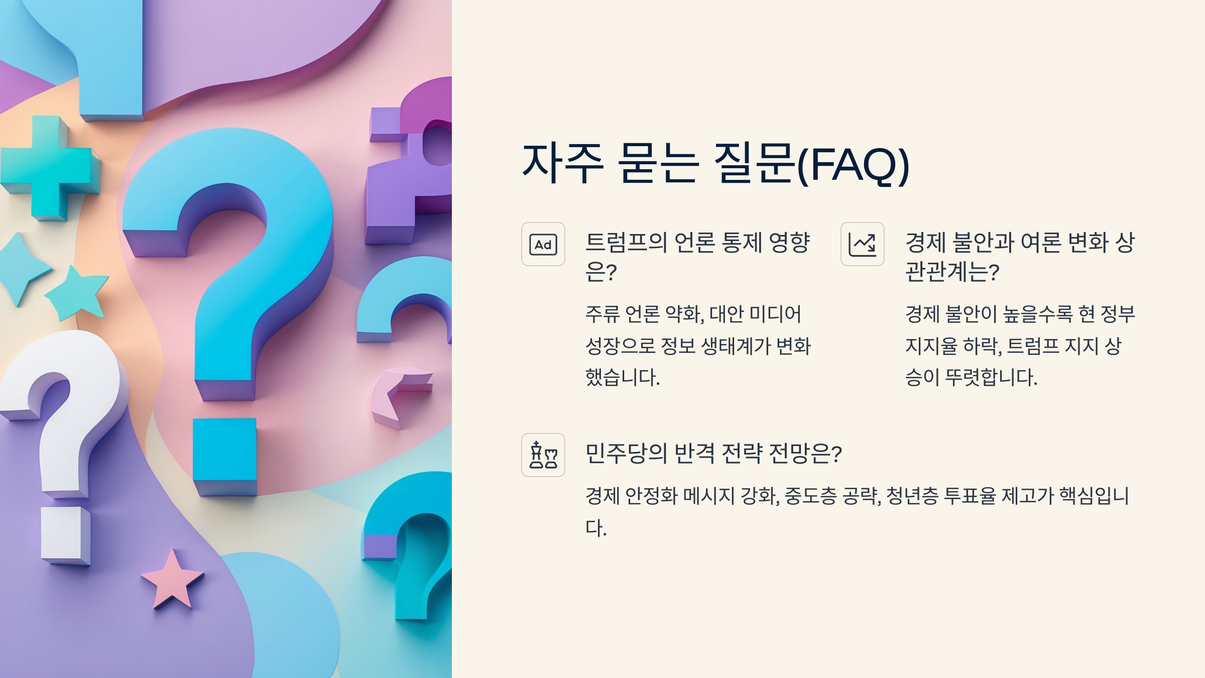 표를 보면 알 수 있듯이, 단순한 수치보다도 사람들이 느끼는 '불안'이 더 중요해요. 트럼프는 바로 그 불안을 자극하는 메시지를 지속적으로 던지면서 지지율을 끌어올리고 있어요. 그는 문제를 해결하겠다는 계획보다, 분노를 해소할 언어를 제공하고 있는 거죠.