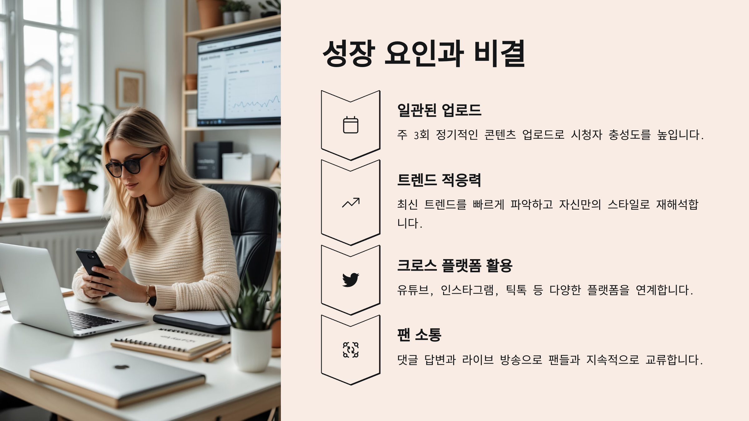 콘텐츠 제작 주기가 일정하다는 점도 중요한 성공 포인트예요. 정해진 요일에 영상을 올리기 때문에, 구독자들은 자연스럽게 새로운 영상이 언제 올라올지 기대하고 기다리게 되죠. 이렇게 꾸준함이 신뢰로 이어지고 있어요.