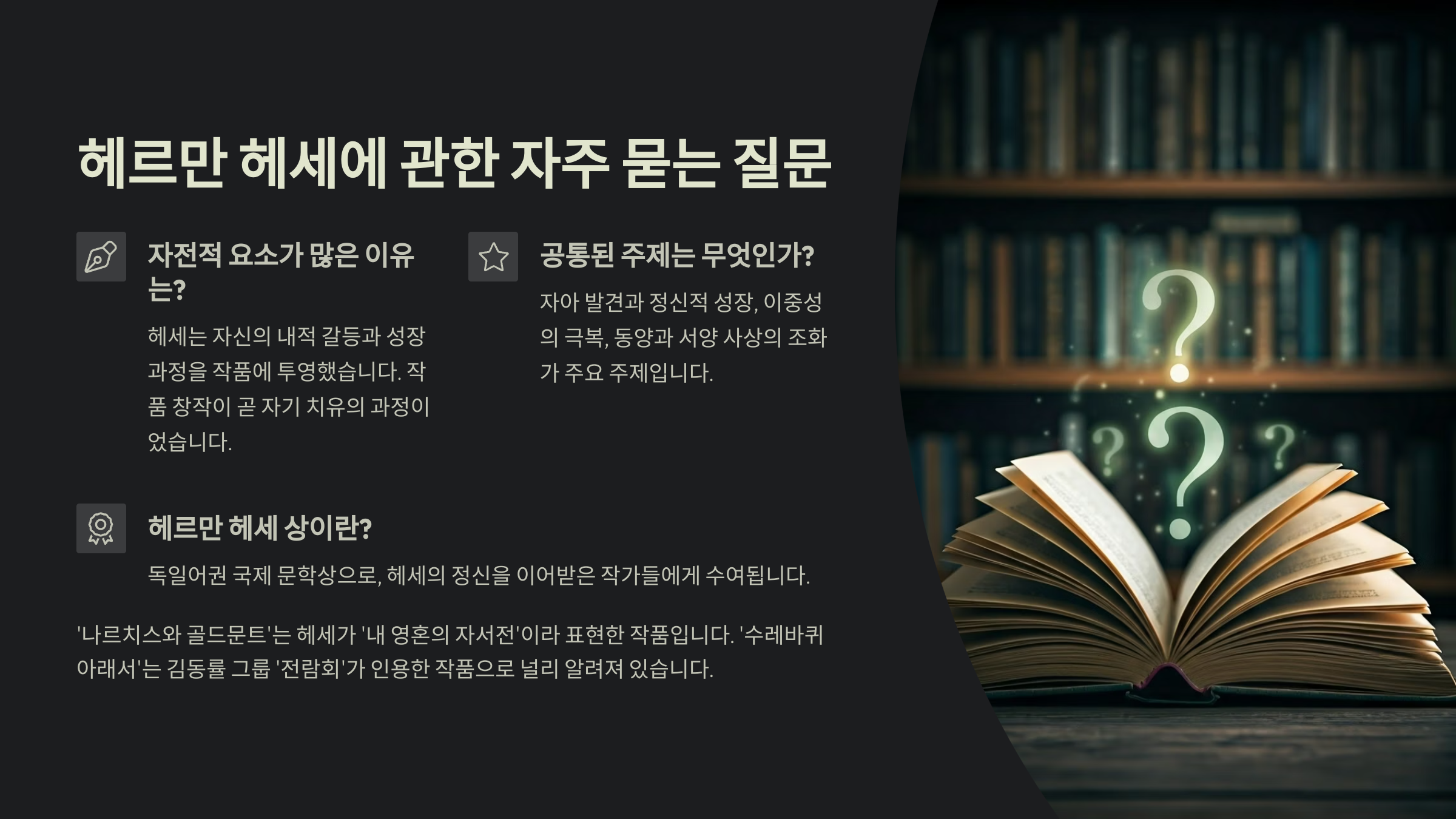 A1. 입문자라면 『데미안』 → 『시타르타』 → 『크눌프』 순서를 추천해요. 그다음 『황야의 이리』와 『유리알 유희』로 넘어가면 자연스럽게 이해할 수 있어요.
