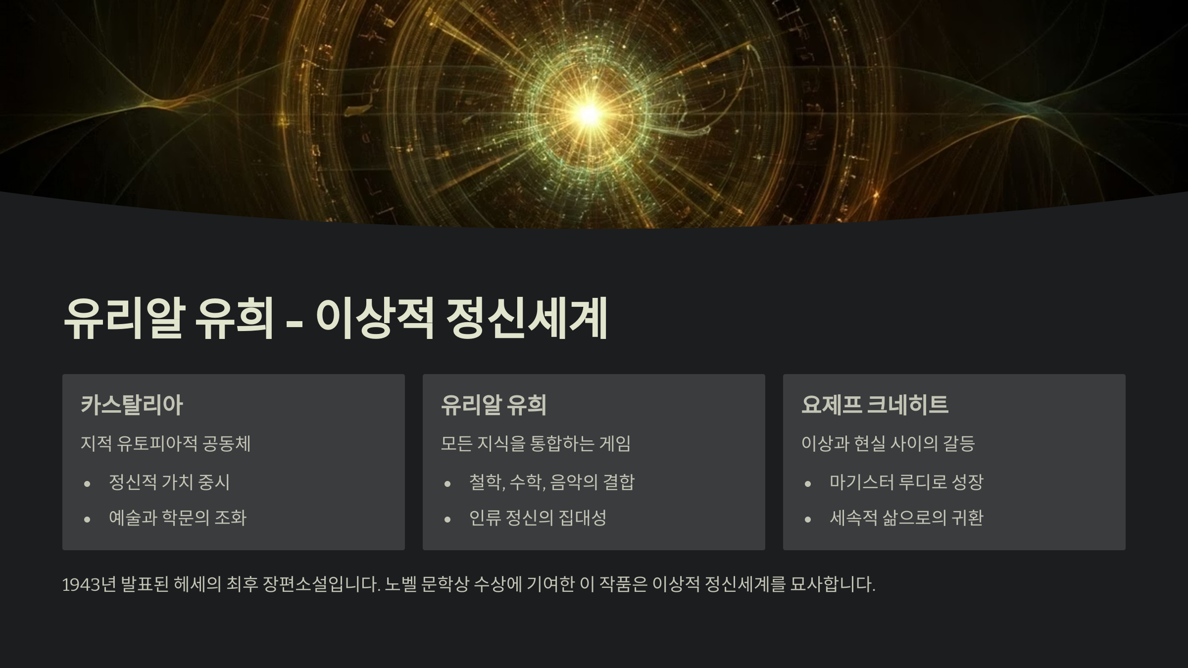 | 유리알 유희 | 학문과 예술 통합의 상징적 게임 |