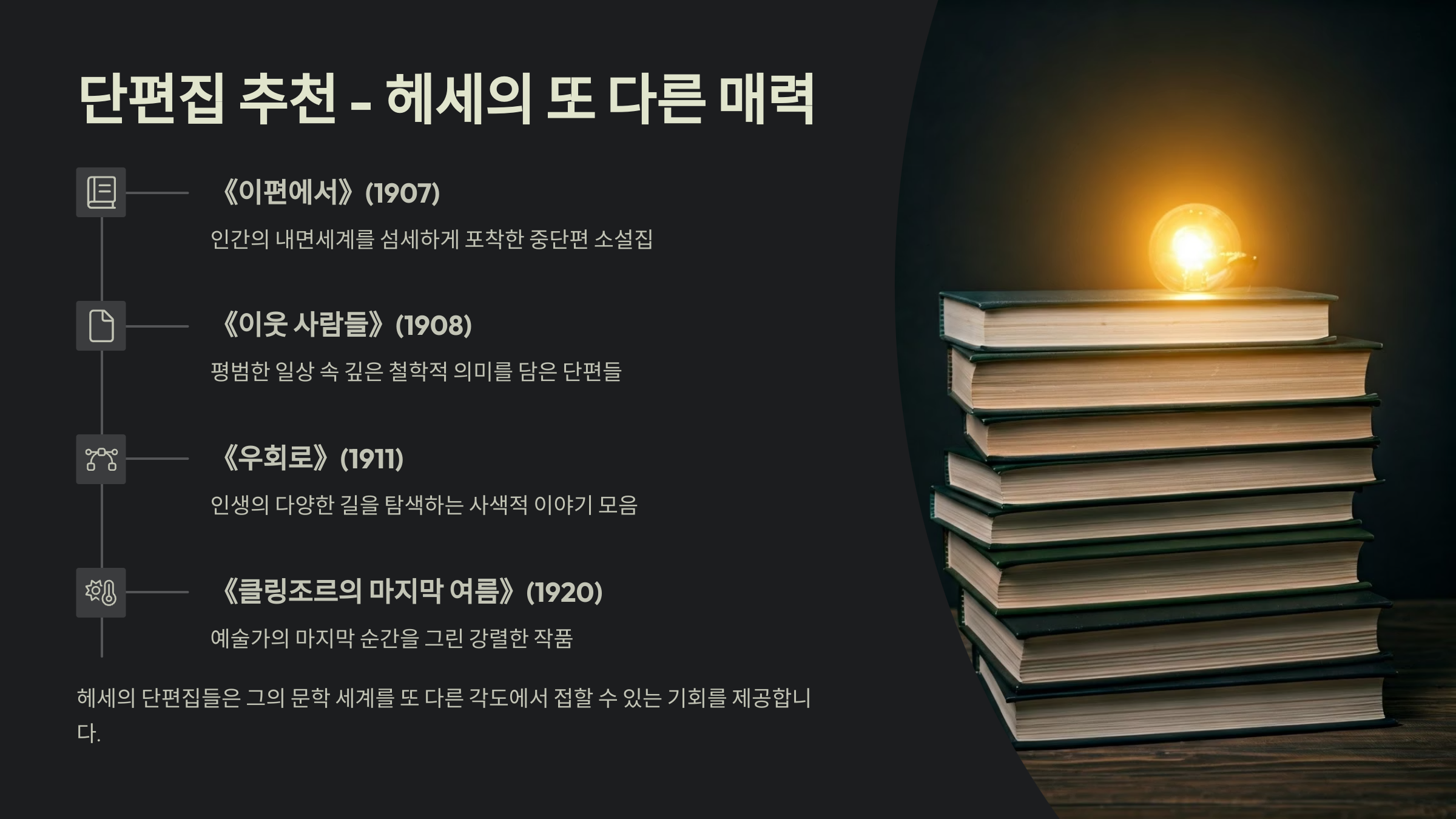 장편소설로 유명한 헤세지만, 그의 단편들도 정말 깊고 아름다워요. 오히려 장편보다 빠르게 몰입할 수 있어서 처음 입문하는 분들께도 좋아요.