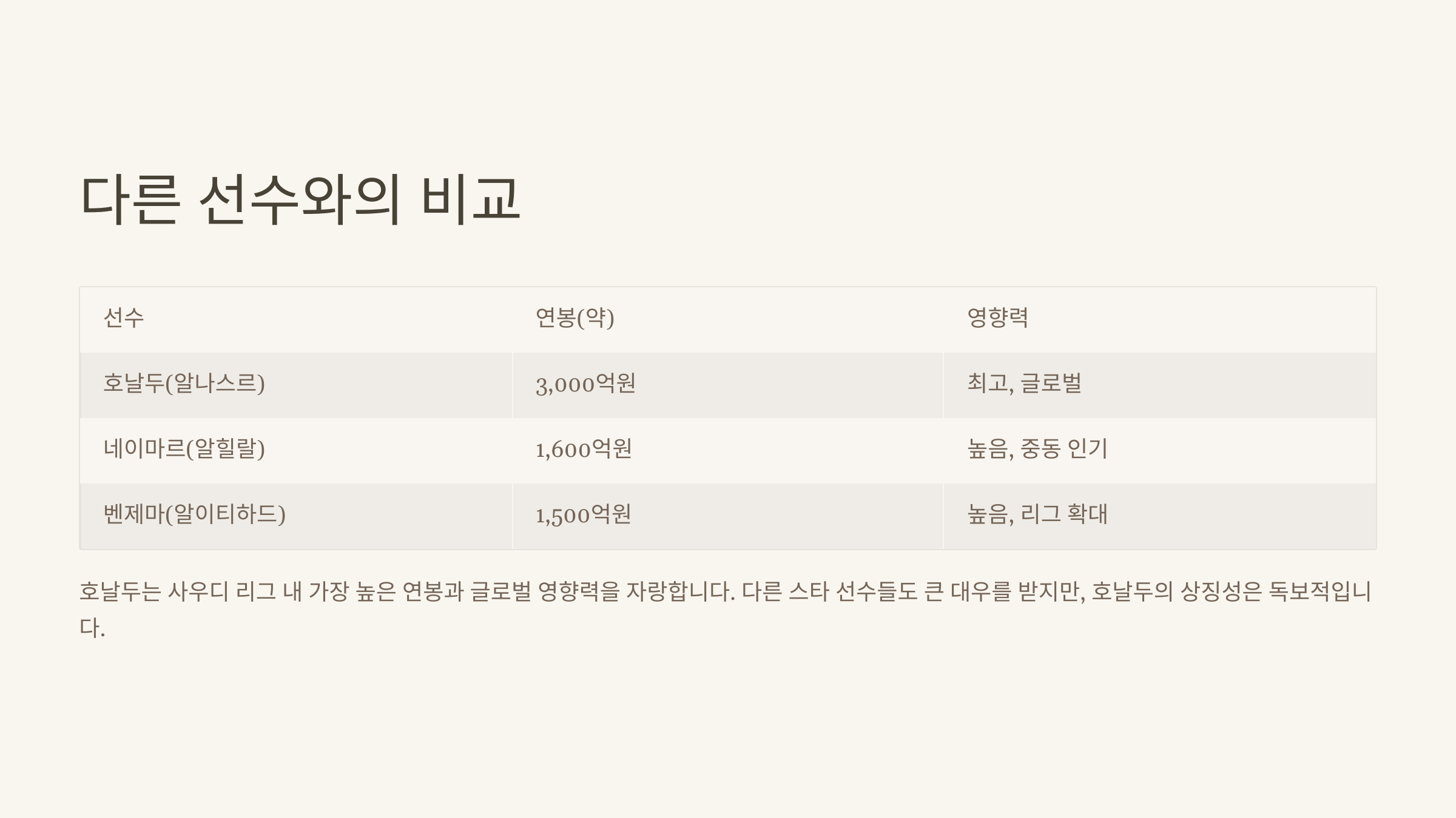 이 외에도 사디오 마네, 헨더슨, 파비뉴 같은 선수들이 리그에 합류했지만, 그 누구도 호날두만큼 ‘리그 전체를 바꾼 인물’로 평가되진 않아요. 그들의 계약은 호날두 이후에 가능해졌고, 사실상 호날두가 문을 연 셈이에요.
