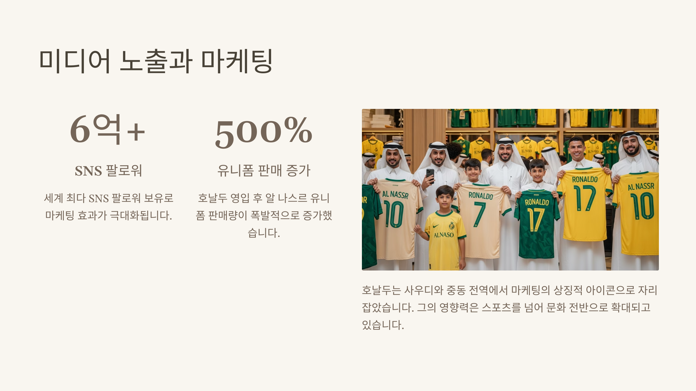 호날두가 팀에 합류한 이후, 알나스르의 인스타그램 팔로워 수가 20배 이상 증가했고, 구단 굿즈 매출도 폭발적으로 증가했어요. 이 모든 지표들이 호날두 한 명으로 인해 변화했다는 걸 보여줘요. 이런 영향력은 돈으로 환산하기 힘들 정도예요.