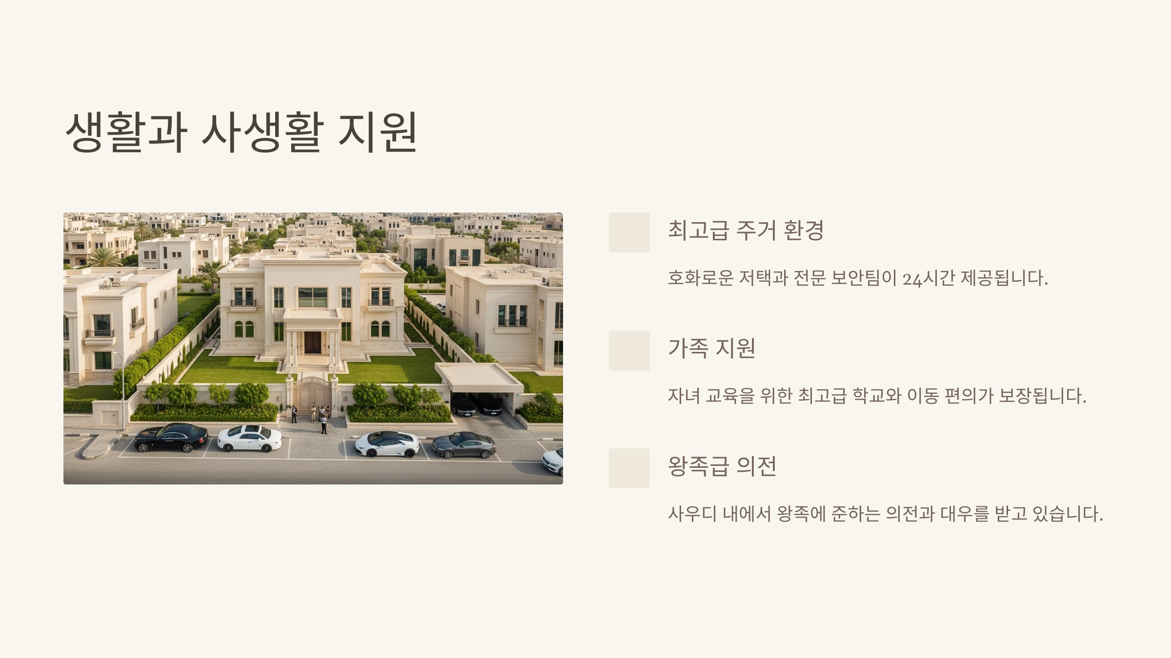 | 주거 지원 | 최고급 주택 제공 + 보안 인력 배치 |