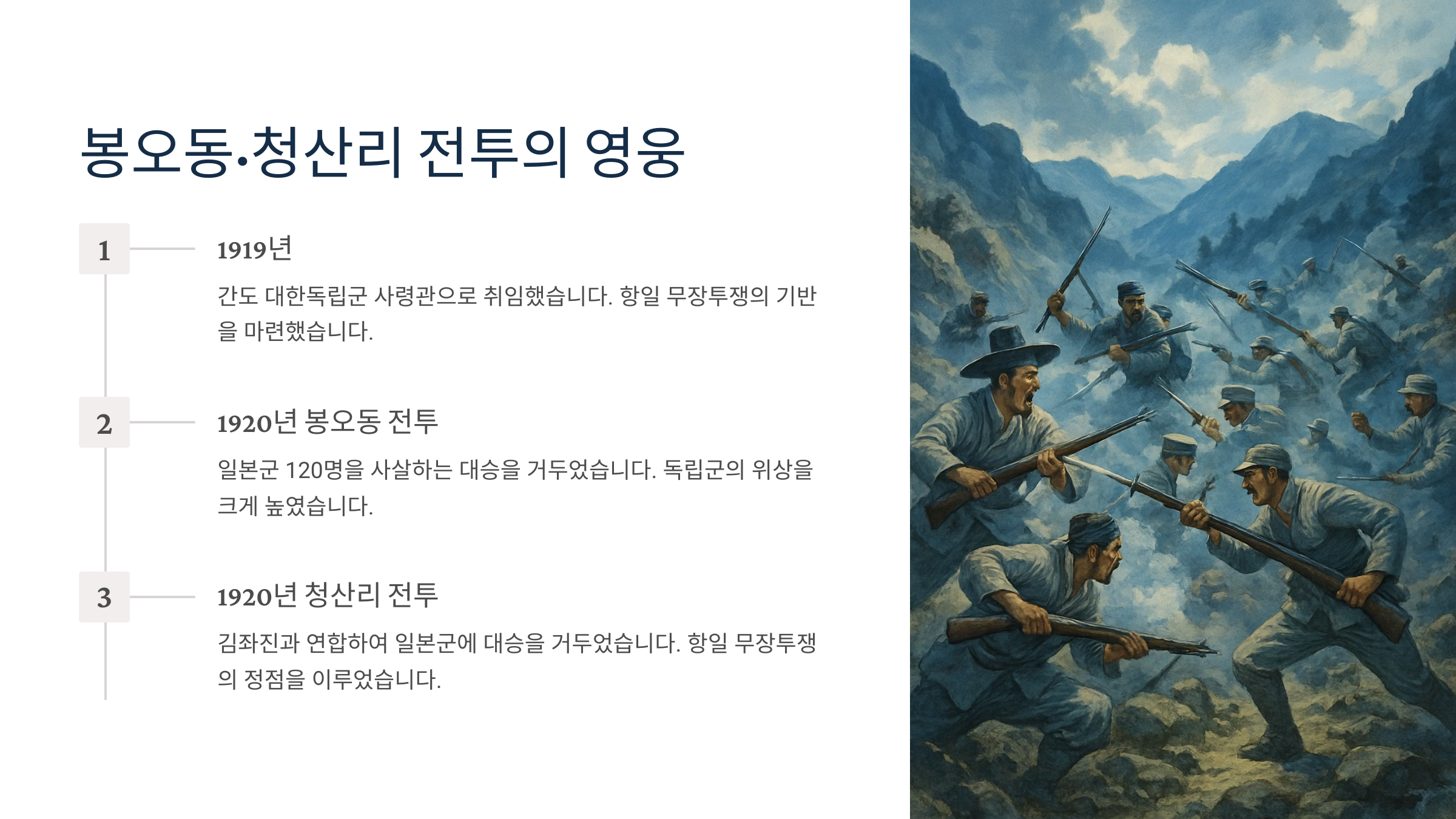이어 같은 해 10월엔 청산리 전투가 벌어졌어요. 김좌진 장군의 북로군정서군과 함께 협력한 이 작전에서도 홍범도는 독립군 연합부대의 핵심 역할을 맡았어요. 전략적 협공과 기습으로 일본군에 큰 타격을 입혔고, 이는 독립운동의 역사에 길이 남을 전투로 기록됐답니다. 당시 일본군의 사상자는 수천 명에 달했지만 독립군은 피해를 최소화했죠.