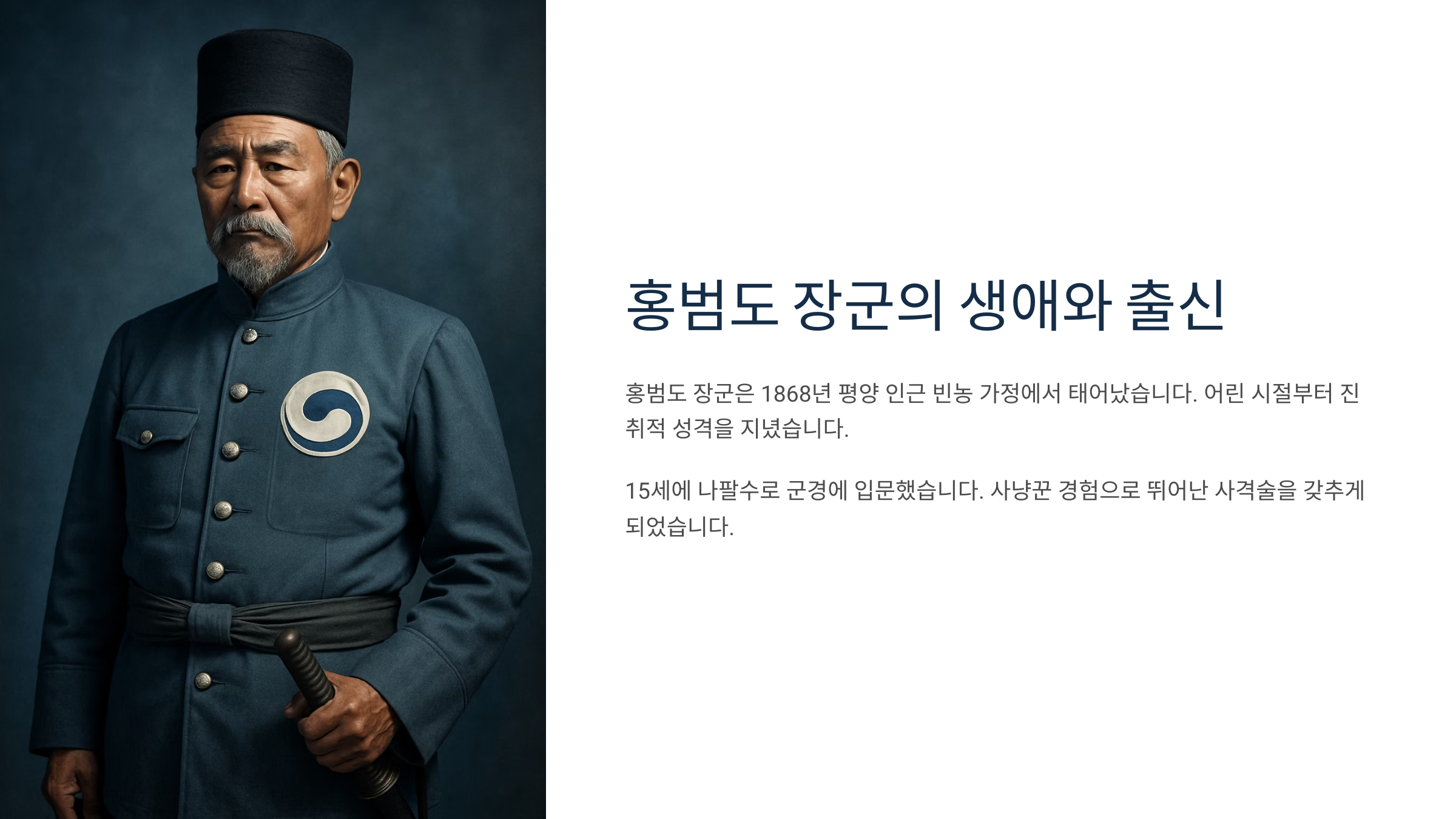 홍범도는 1868년 평안남도에서 태어났어요. 가난한 집안에서 태어난 그는 어린 시절 부모를 잃고 머슴살이나 노동으로 생계를 이어갔죠. 문맹이었지만 민첩하고 용맹한 성격 덕분에 산적을 토벌하는 포수로 활동하면서 전투 감각을 키웠답니다.