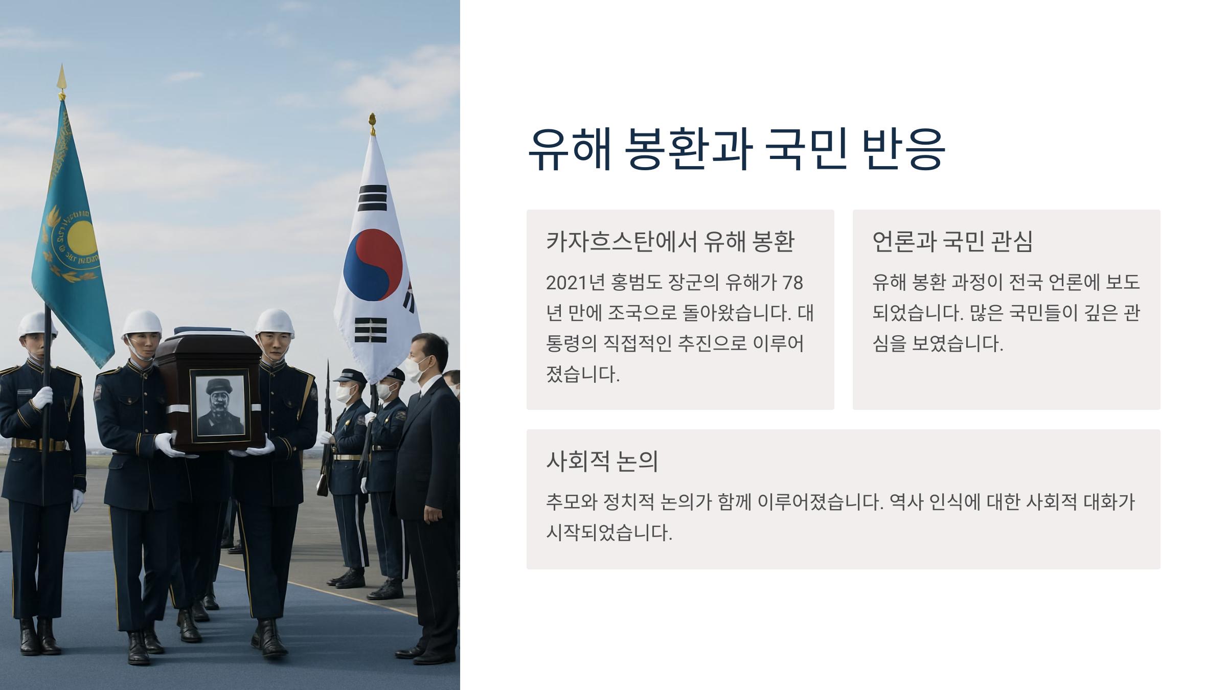 2021년 8월, 광복절을 앞두고 대한민국은 역사적인 순간을 맞이했어요. 홍범도 장군의 유해가 78년 만에 카자흐스탄 크질오르다에서 대한민국으로 돌아온 거예요. 당시 정부는 군용 수송기와 의장대까지 동원해 장군의 봉환을 예우 있게 진행했고, 전 국민이 그의 귀환을 환영했죠.