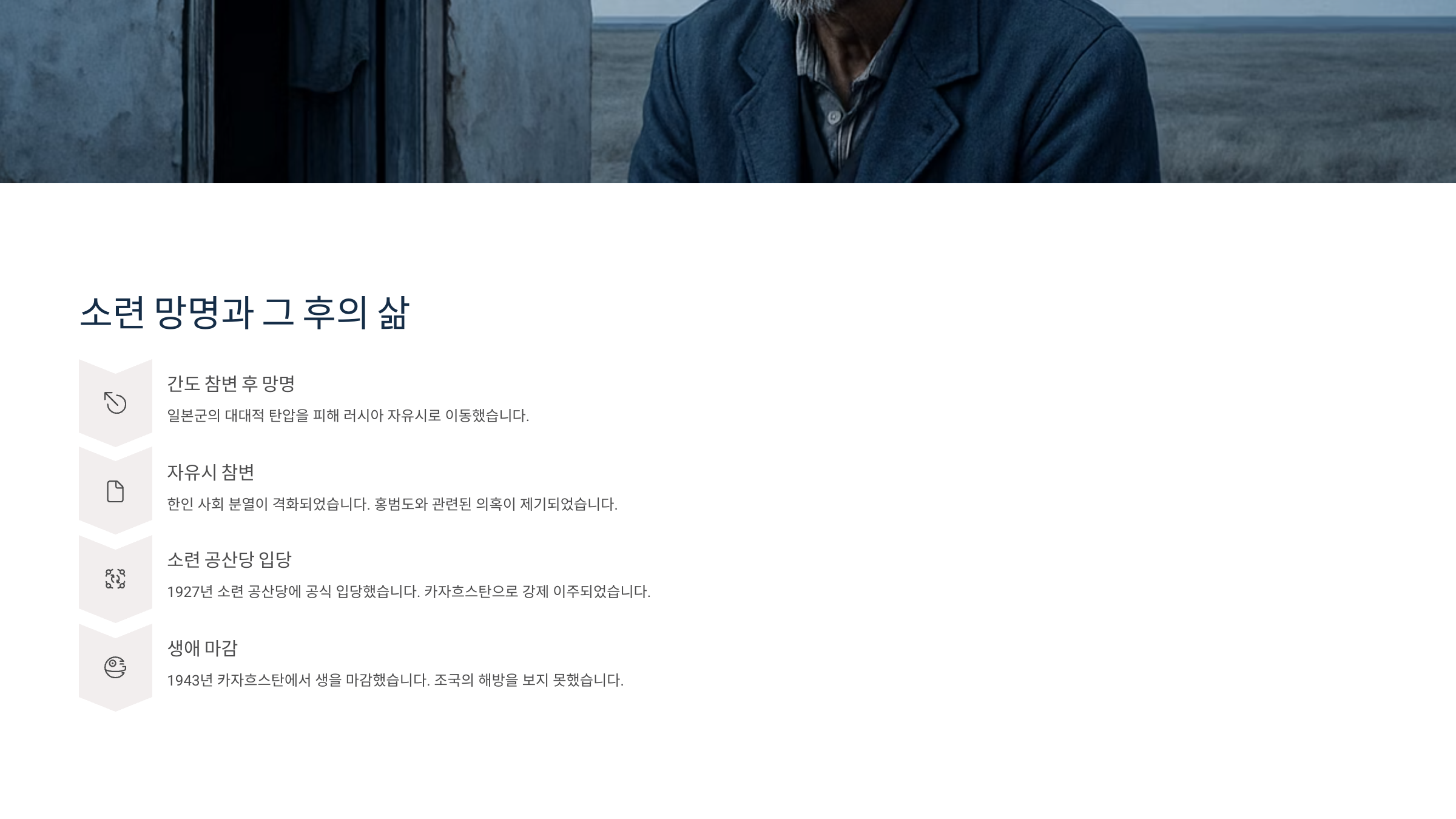 소련에서의 삶은 결코 화려하지 않았어요. 그는 카자흐스탄 크질오르다 지역에서 극장 관리인, 집배원 등으로 일하며 조용히 살아갔어요. 가난했지만, 그는 항상 조국을 그리워했고, 후손들에게 독립의 꿈을 전하곤 했죠. 소련 정부도 그를 특별히 대우하지 않았고, 그는 1943년 75세의 나이로 외롭게 생을 마감했답니다.