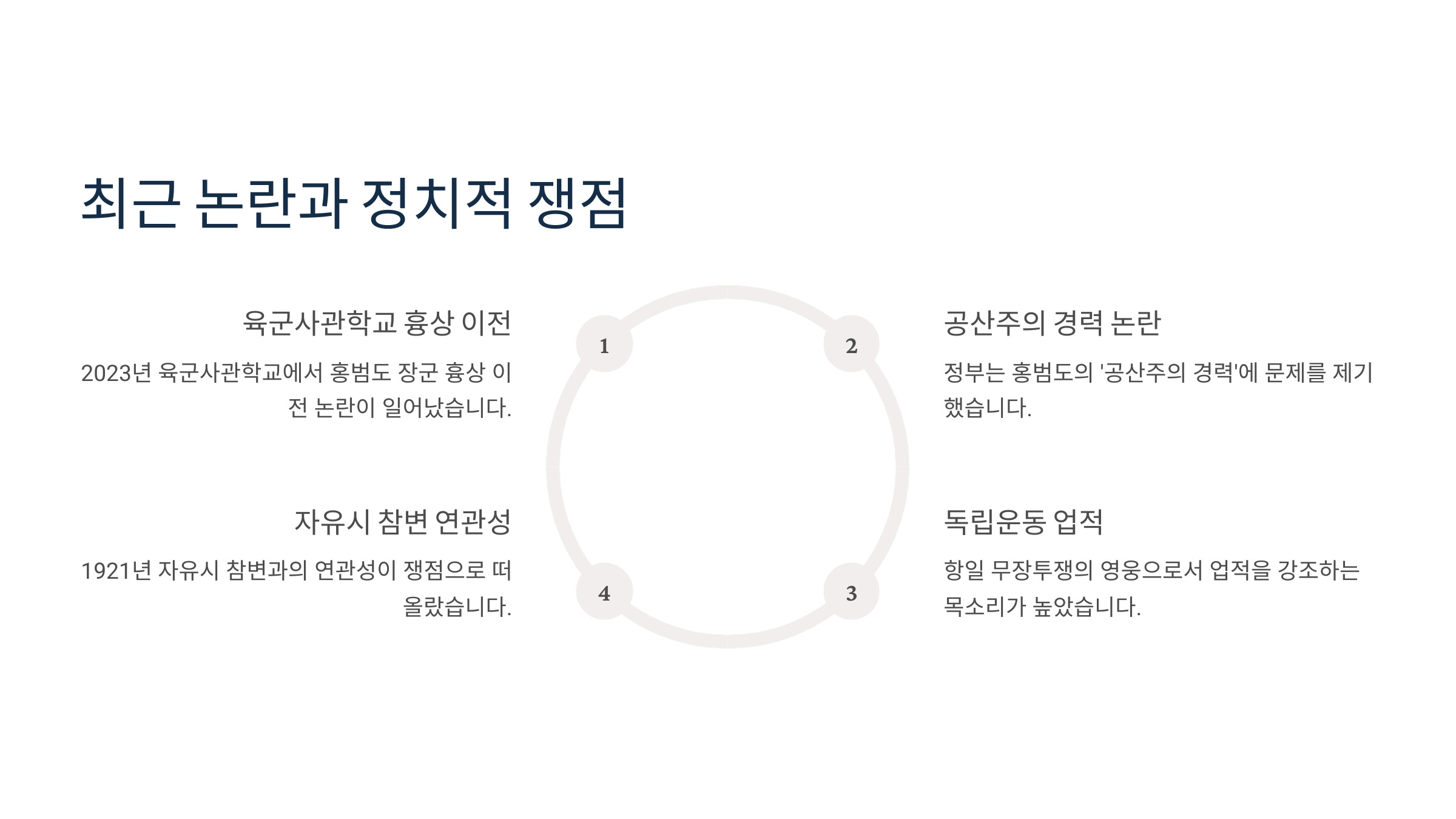 하지만 2023년 윤석열 정부 출범 이후, 갑자기 홍범도 장군의 이념 성향을 문제 삼는 논의가 불거졌어요. 특히 그는 과거 소련 공산당에 가입했었고, 이 점이 정치적으로 부각되면서, 그의 흉상을 육군사관학교에서 철거하는 결정이 나왔죠. 이것은 국내외적으로 큰 파장을 일으켰어요.