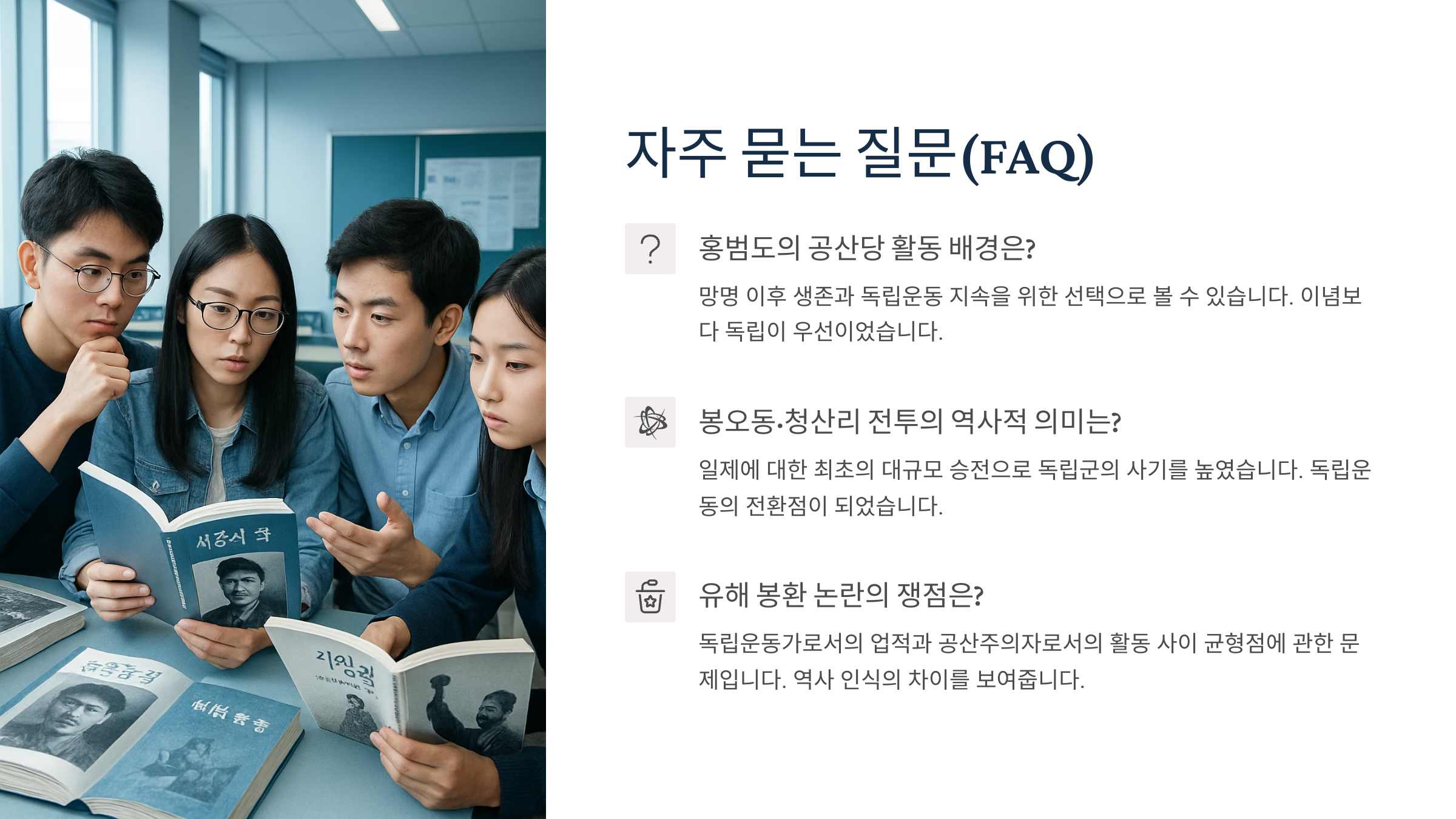 📍 우리는 이제 마지막으로, 홍범도 장군과 관련해 많은 분들이 궁금해했던 내용을 FAQ로 정리해드릴게요. 아래에서 확인해 주세요!