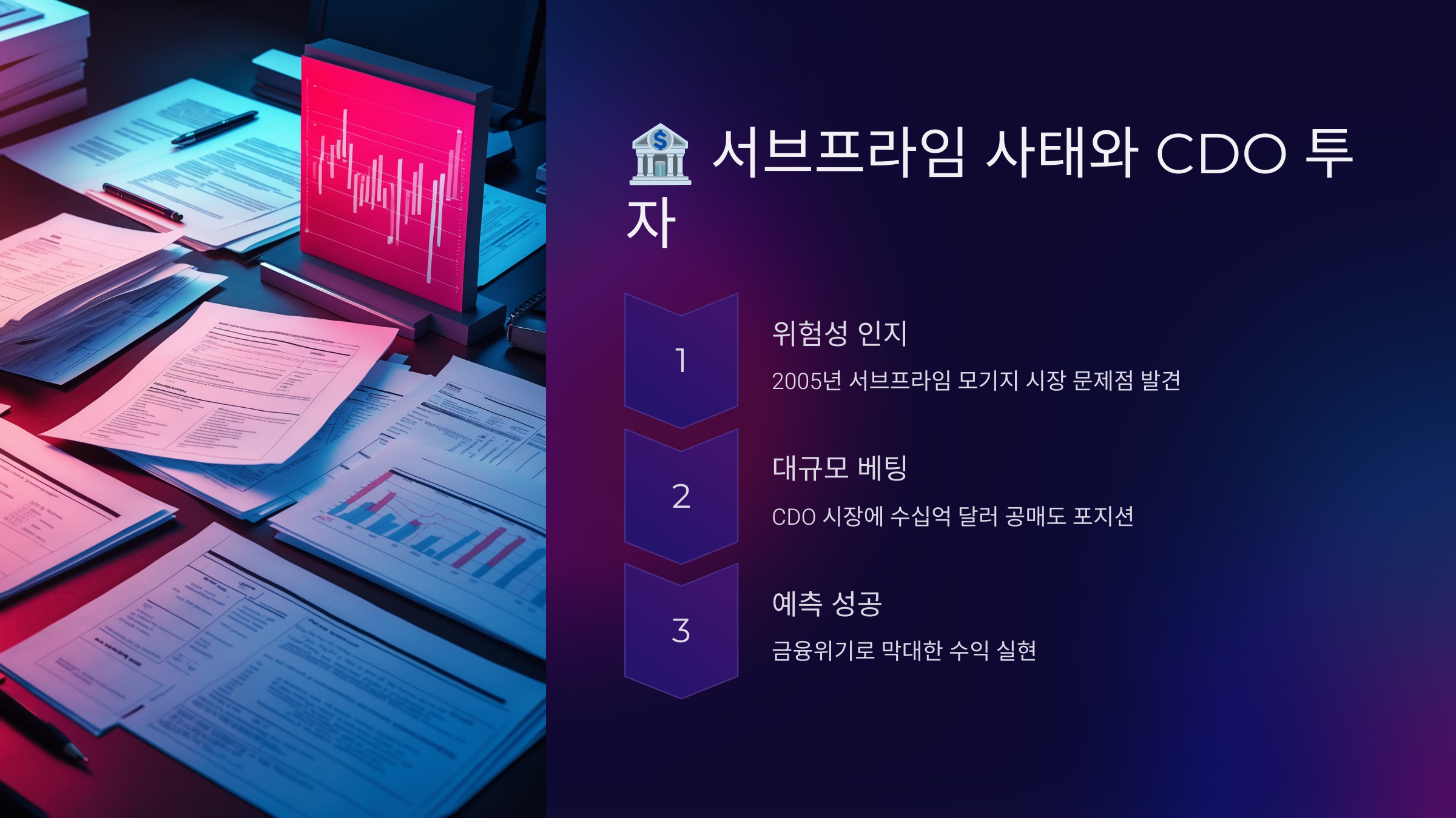그가 고안한 전략은 바로 CDS(Credit Default Swap)라는 신용부도스와프 상품에 투자하는 것이었어요. 즉, 부동산 시장이 망할 경우 수익이 나는 '보험' 같은 투자였죠. 그는 대형 투자은행들과 계약을 체결하며 어마어마한 규모의 CDS를 사들이기 시작했어요.