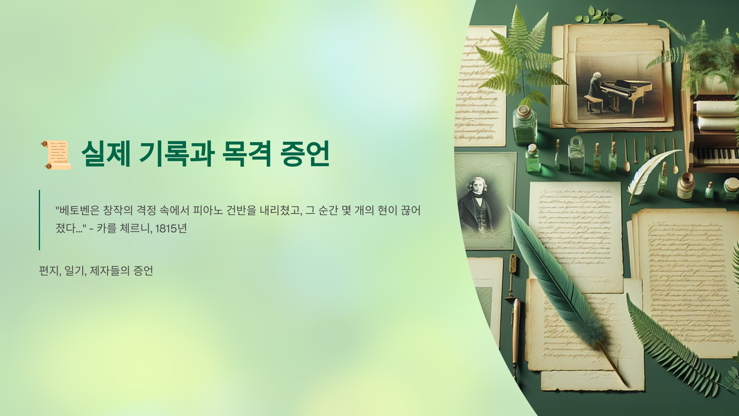 📖 베토벤이 피아노를 부쉈다는 이야기는 단지 민간 전설이 아니에요. 그를 가까이서 지켜본 사람들의 편지, 일기, 보고서 등을 통해 실제로 존재하는 사건임을 확인할 수 있어요. 가장 유명한 기록 중 하나는 그의 조카 카를이 남긴 증언이에요.