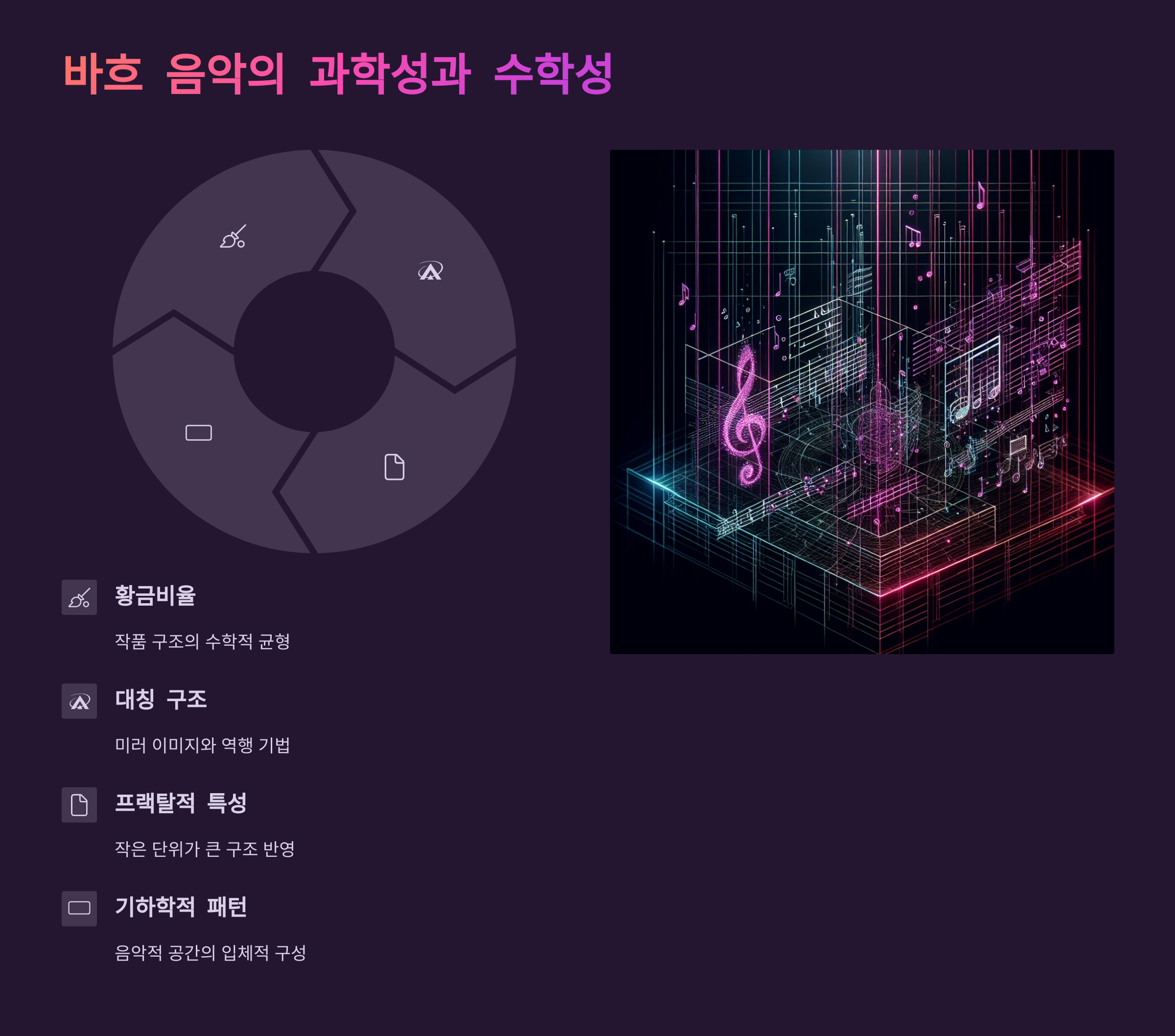 🧮 아래 표에서 바흐의 음악에 숨어 있는 수학적 구조들을 정리해봤어요. 숫자와 음악의 연결이 얼마나 흥미로운지 직접 확인해보세요!