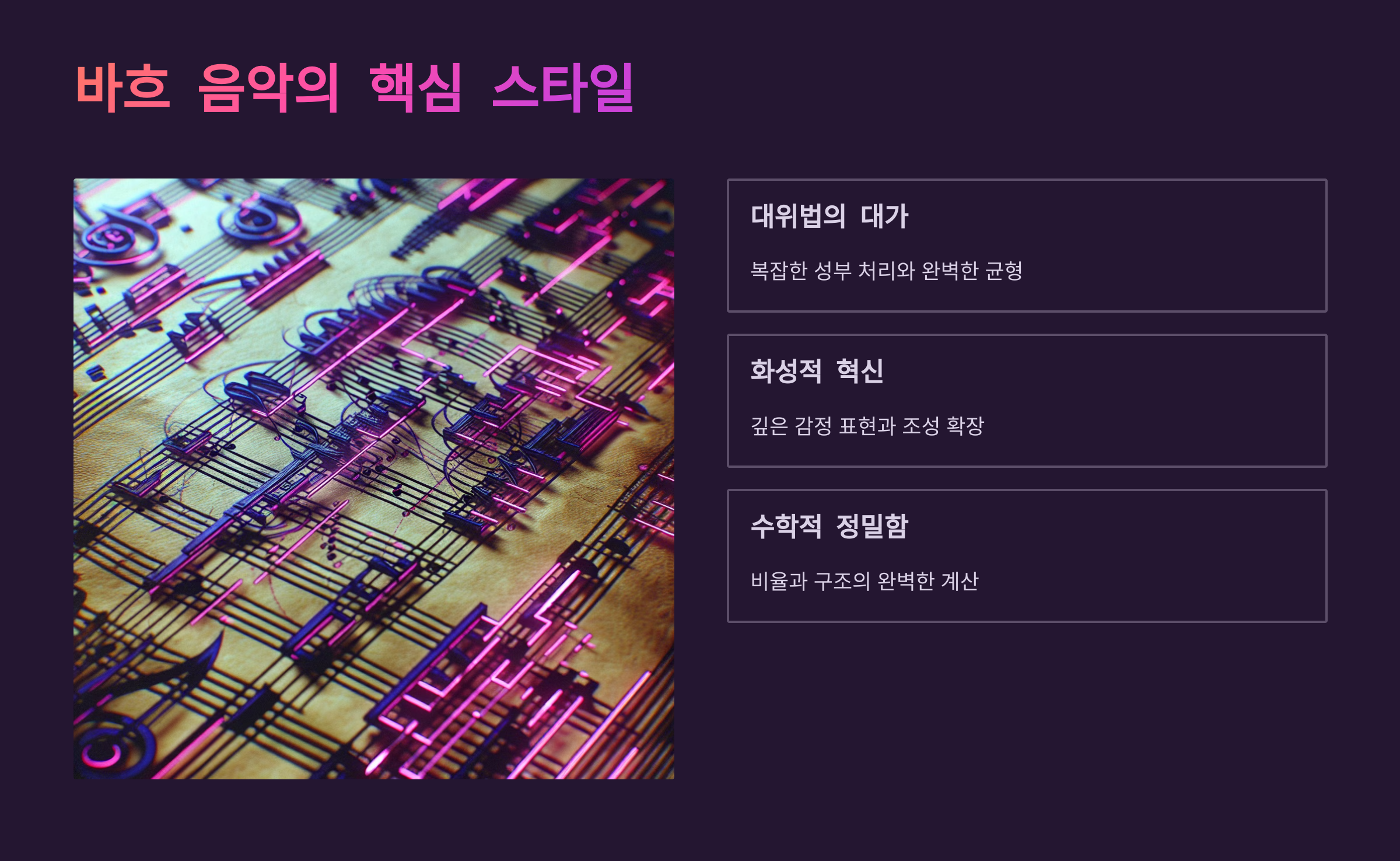바흐의 음악은 듣는 것만으로도 감동이 있지만, 분석하면 할수록 숨은 구조의 아름다움이 드러나요. 음악이 단지 감정의 표현만이 아니라, 인간 사고의 결정체일 수 있다는 걸 바흐는 보여줬어요.