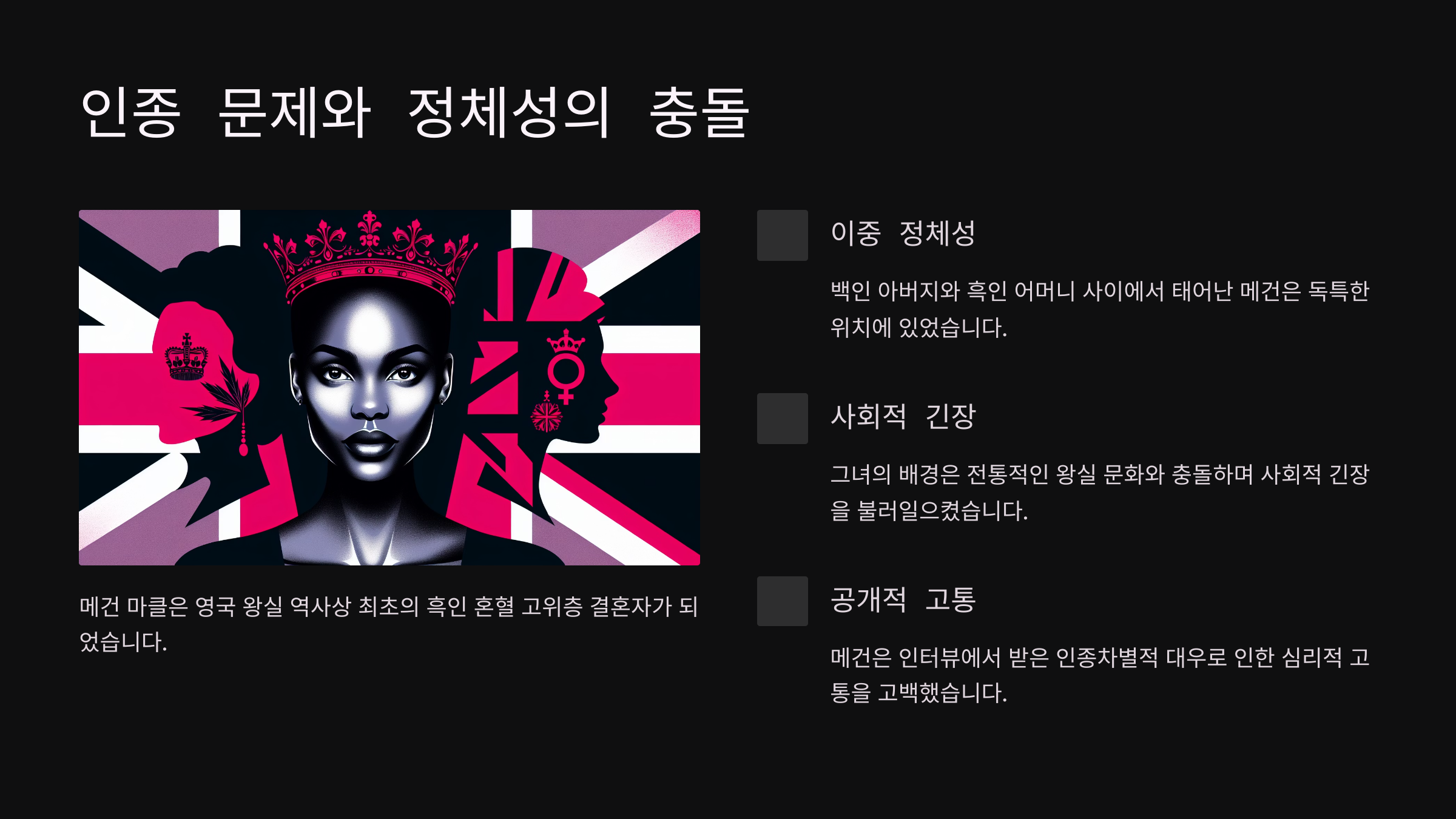 🧬 메건 마클은 아프리카계 미국인 어머니와 백인 아버지 사이에서 태어났어요. 혼혈이라는 정체성은 그녀의 삶에 큰 영향을 주었고, 그녀는 이를 자랑스럽게 여겼죠. 하지만 영국 왕실이라는 전통과 백인 중심적 조직 안에서 이 정체성은 조용히 무시되거나 때로는 공격의 대상이 되었어요.