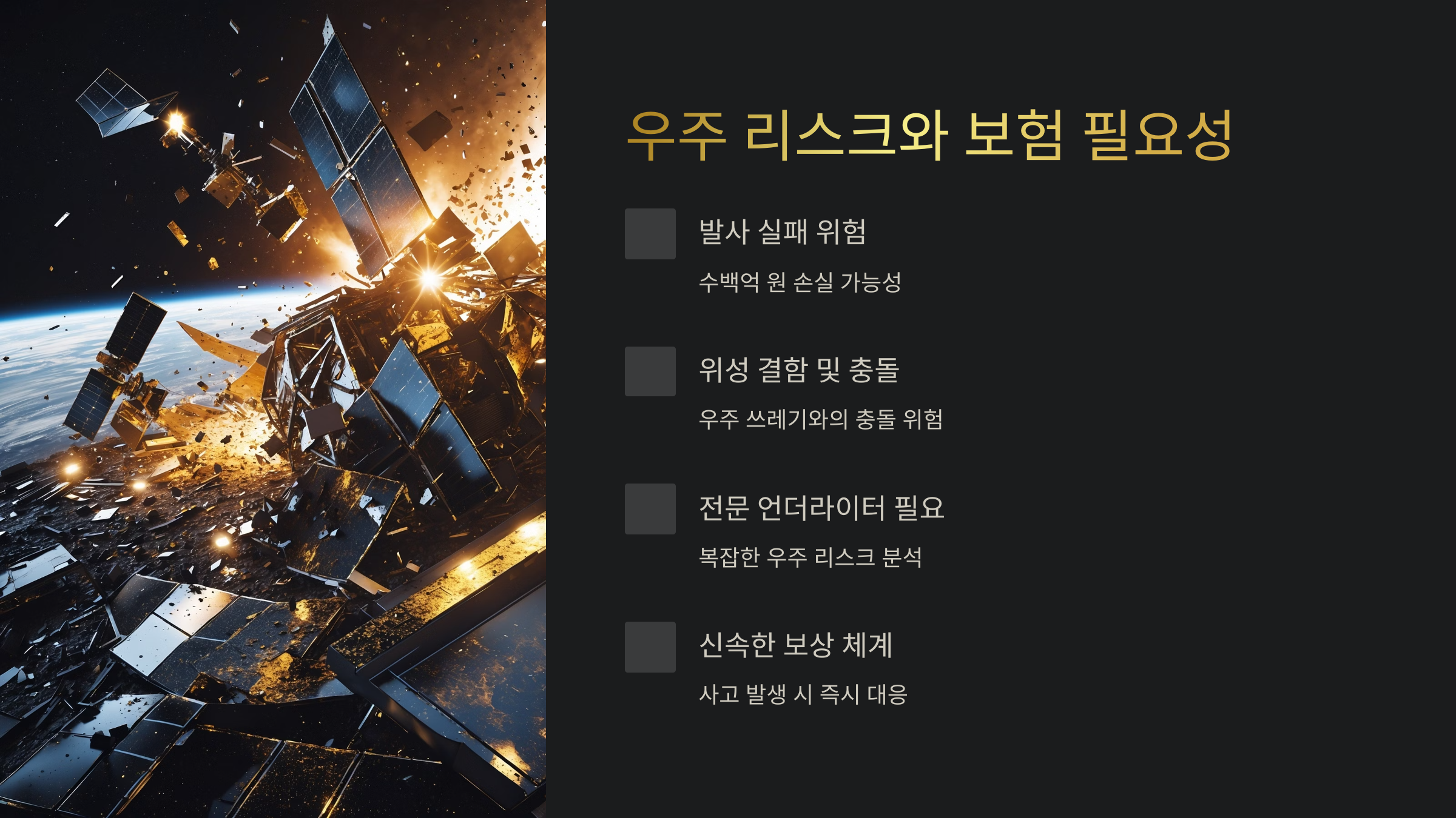 💡 우주에서는 작은 사고 하나도 수백억의 피해로 이어질 수 있어요. 보험은 안전망이에요!