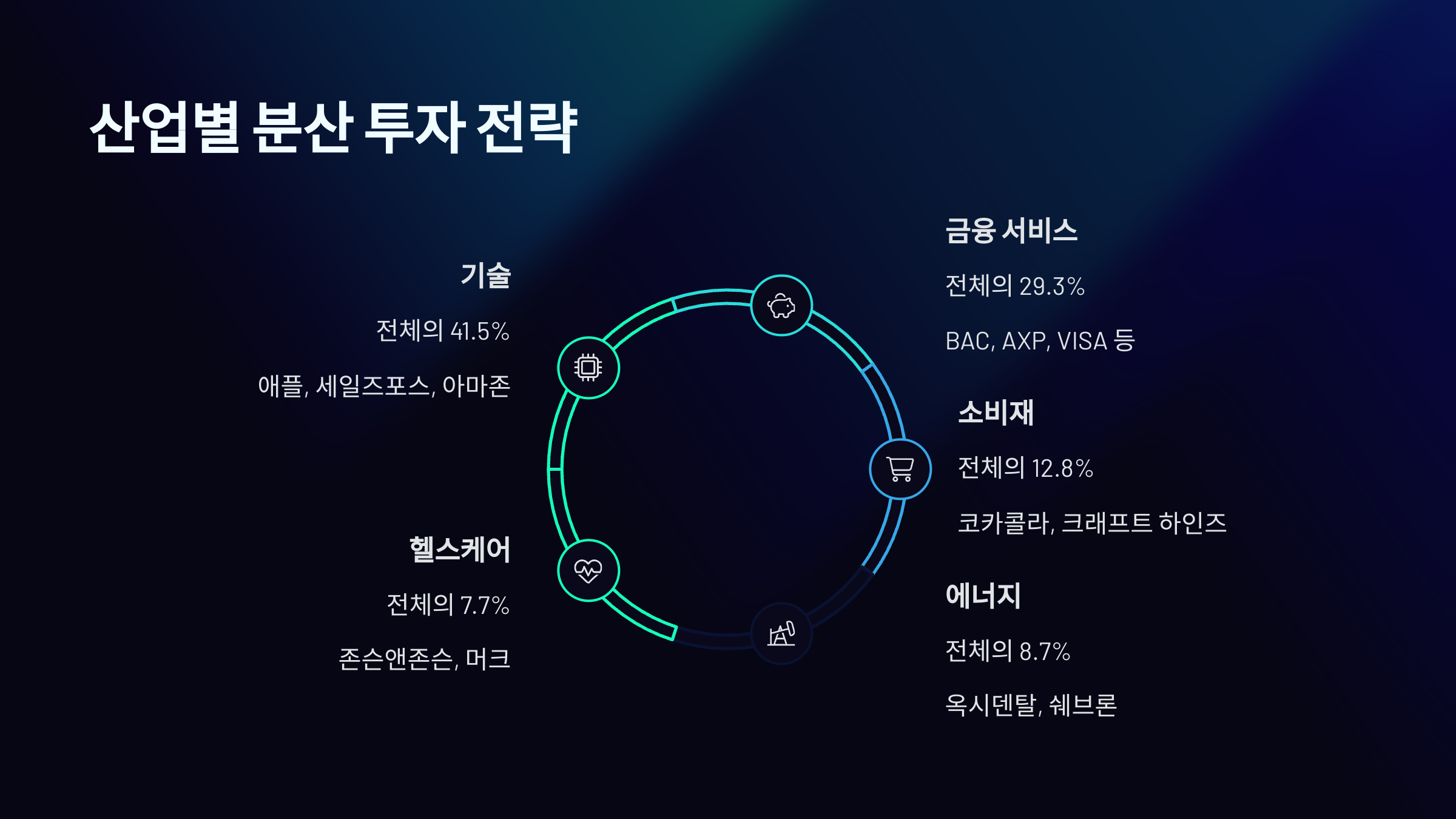 워렌 버핏의 포트폴리오는 처음 보면 애플 중심의 '집중투자'처럼 보여요. 하지만 자세히 들여다보면 산업 분산이 잘 되어 있어요. 기술, 금융, 소비재, 에너지, 운송 등 다양한 분야에 걸쳐 리스크를 나누고 있죠.